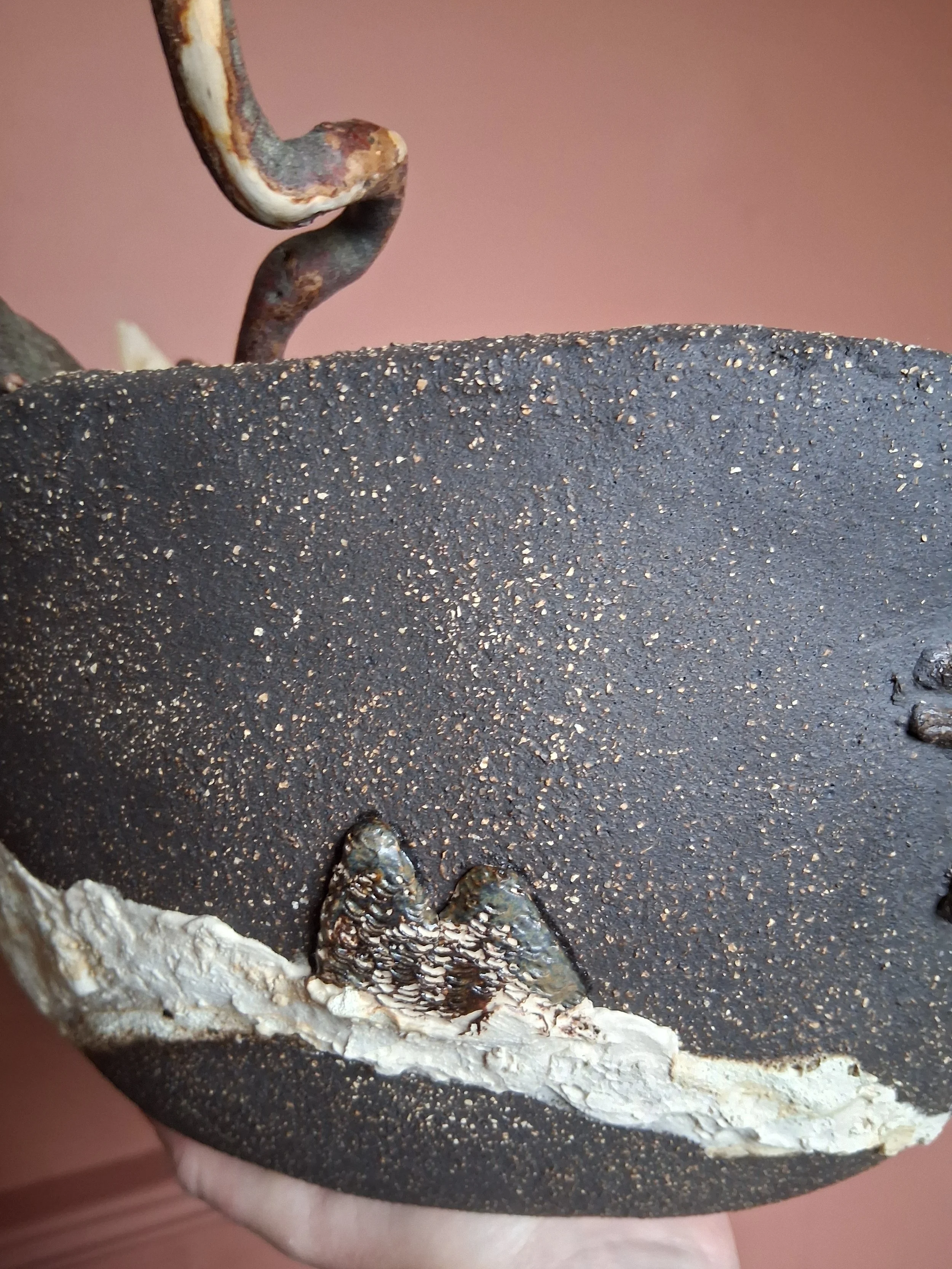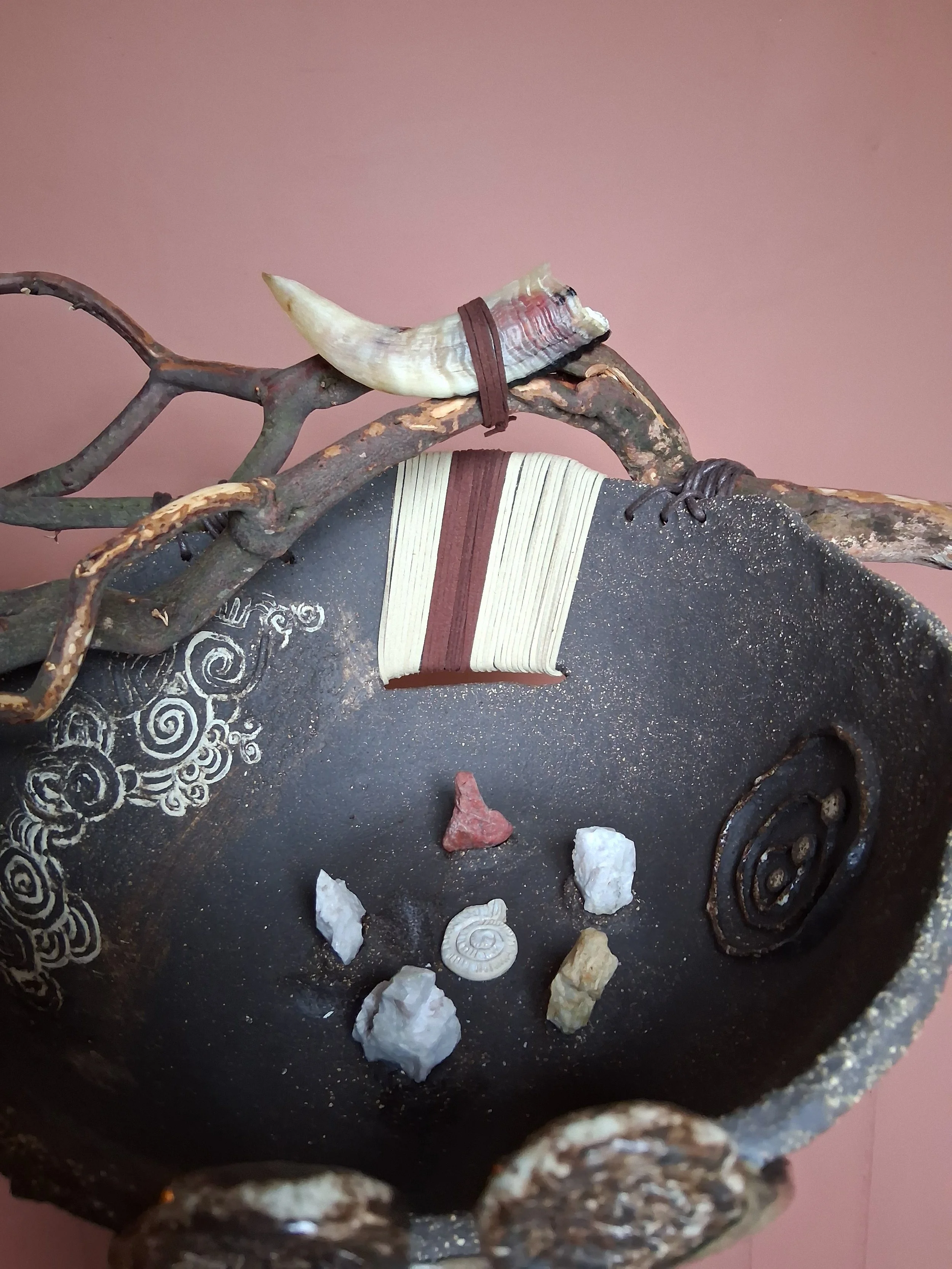 A handcrafted black and white stoneware Sacred Vessel grounded with leather bound willow driftwood and a lamb's horn from the Dingle Peninsula. This client commissioned her vessel ahead of the birth of her third son. She was a cycle-breaker, choosing to birth her son at home, nestled in the embrace of the mountains. This vessel encompasses the warriors Torc, the paps and river of Anú, ogham sentinels reading the oak and the rowan, ancestral holding, Irish rock art, and a standing stone circle with red sandstone and quartz from Kerry.Ancestral Healing Sacred Birth Vessel