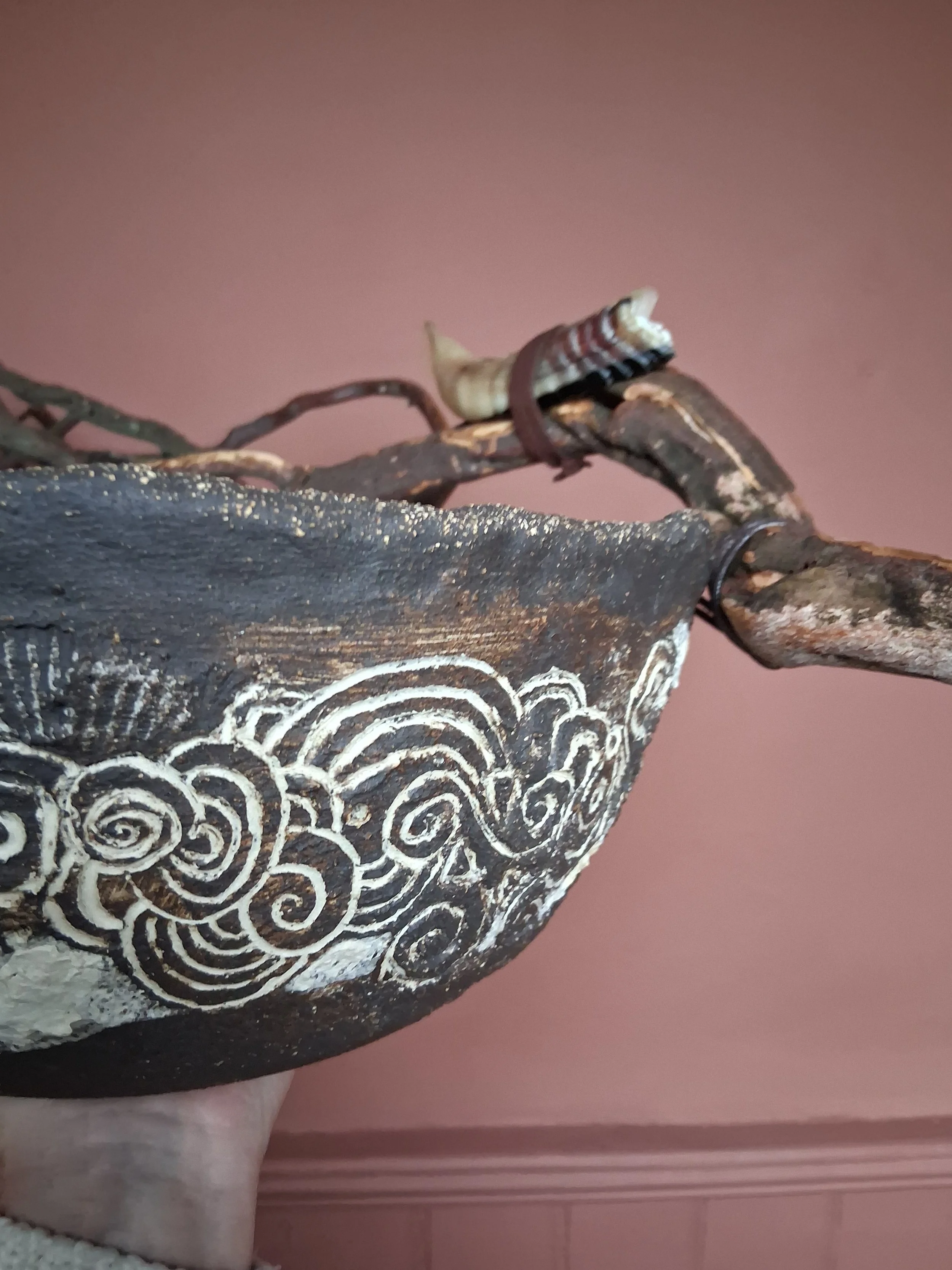 A large buff stoneware sacred vessel expressively glazed in whites and magma, revealing an interior engraving of the bear spirit and an exterior engraving ancestral holding. Grounded by fallen branches and roots from the Killarney National Park, Ireland and bound in earth coloured leather. This piece was commissioned by its guardian to call in the bear spirit ahead of the birth of her son, along with ancestors of generations passed from far wide between the two lineages to hold them safely in his arrival earthside.Homebirth-Rite of Passage